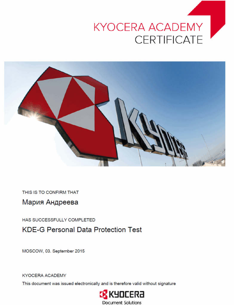 Another crucial brick in the foundation of professional responsibility. A new addition to the KYOCERA ACADEMY certificate collection — successfully completed the course and passed the test on Personal Data Protection.
