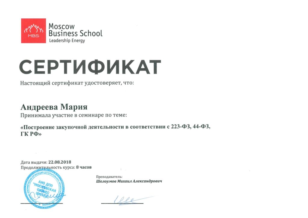 August 22, 2018. Received a certificate from the Moscow Business School for completing an 8-hour intensive course on “Structuring Procurement Activities in Compliance with Federal Laws 223-FZ, 44-FZ, and the Civil Code of the Russian Federation.”