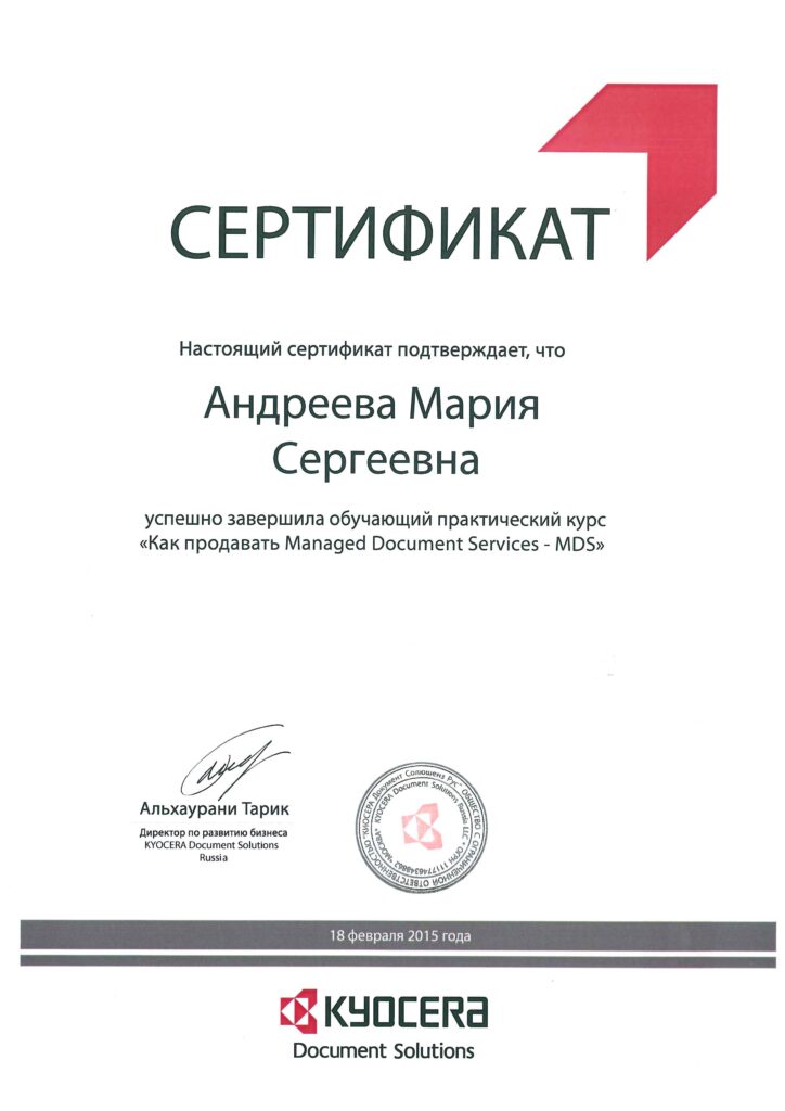 February 18, 2015. Received a certificate for completing the practical course “How to Sell Managed Document Services — MDS.” The course was led by Neringa Romanovskaja — that caliber of expert whose background isn’t just theory, but mountains of real-world cases tackled since 2002.