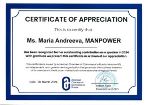 Сертификат о признании выдающимся докладчиком на специализированном мероприятии, посвященном вопросам бизнеса.