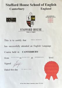 Сертификат о присвоении уровня Intermediate по английскому языку во время обучения в школе.