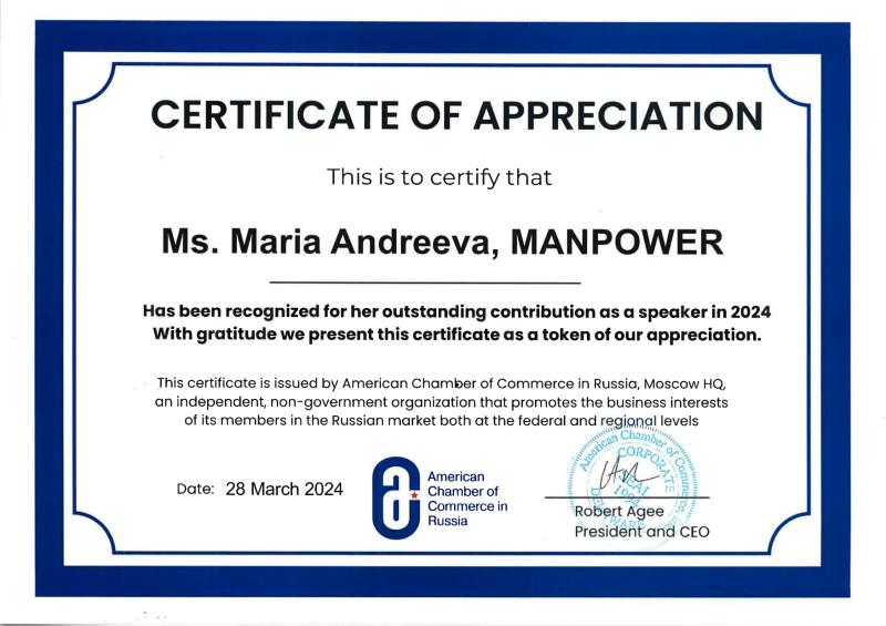 Сертификат о признании выдающимся докладчиком на специализированном мероприятии, посвященном вопросам бизнеса.